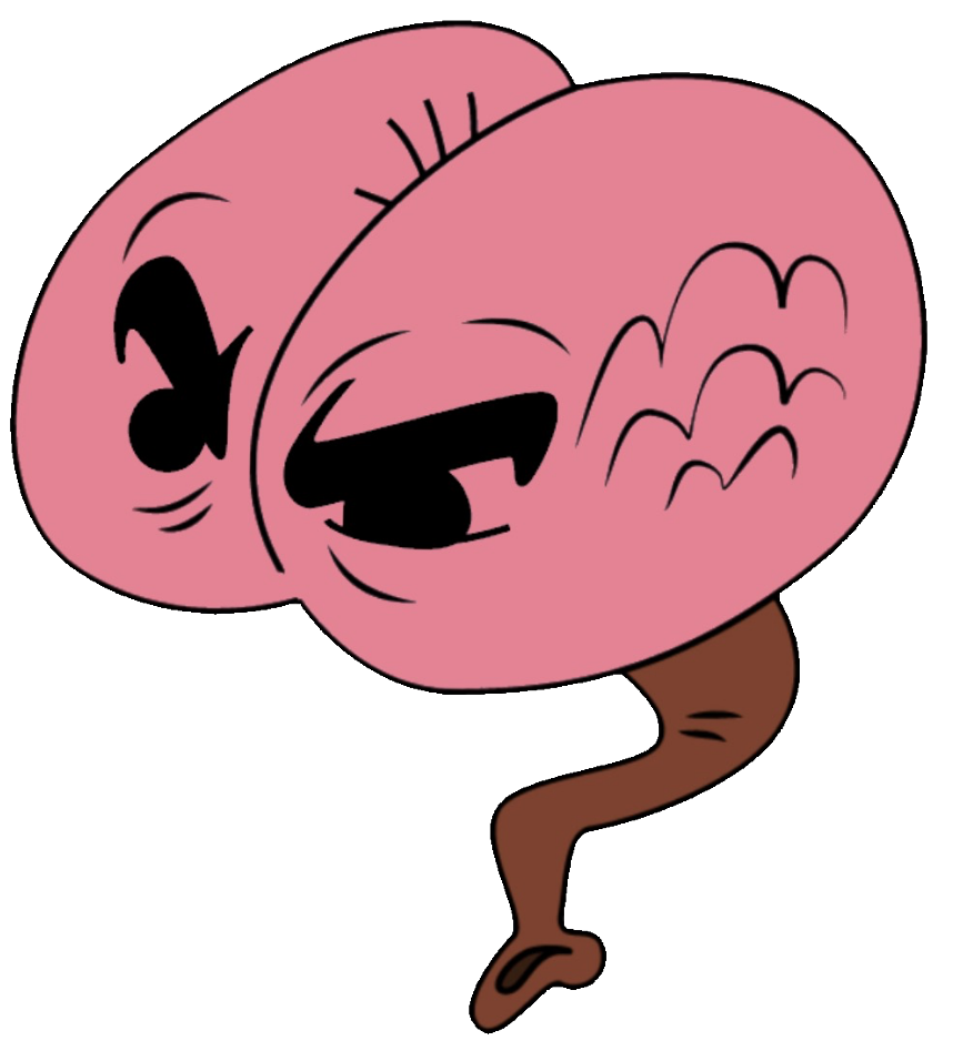 His appearance now is a pink brain with black eyes, his brain stem serving as a hand. Their other side is his own stomach, with three small wrinkles, which, in two of them are hiding two brown eyes. The stomach is also part of what appears to be the esophagus and duodenum. B